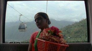 Secondly, inasmuch as the cable-car is a camera obscura, it is also a recording booth. Its domain centres the spherical immersive experience of sound all around – especially in a suspended cable-car high off the ground – and translates to us in the audience a similar ‘other-worldly’ experience of the depicted environment as one which floats the listener in sound’s totality. This is a supremely ‘non-screenic’ effect. The bulk of all cinematic effects is predicated on an illusory window-on-the-world, which in turn is derived from the sensation of situating an audience in a black void box to witness images which appear to come from a zone beyond/behind the screen. Conversely, Manakamana documents its sensory environment by situating the imaginary ear smack in the middle of the world it visually captures.