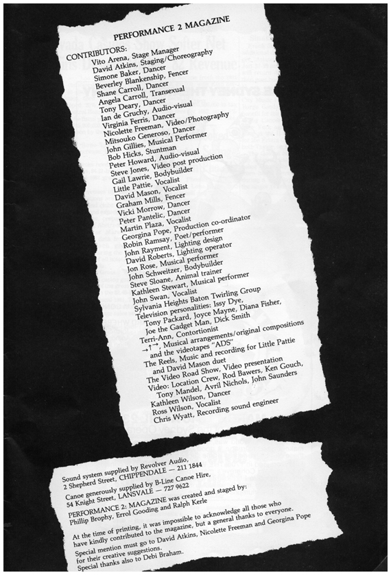 Discussions for the project early on centred the idea of presenting a magazine live on stage - complete with ads, celebrities, non-sequiturs, and video excerpts - all staged like page-flipping. Narrative form was evacuated; in place was the disorienting feeling of randomized performances on a conveyor belt of presentation, each replacing the other. This mode of theatre was central to Ralph's ongoing experiments with performative form and staging. The fact he got the Sydney Theatre Company to mount such an event seemed like an exceedingly unlikely undertaking, but director Richard Wherrett strongly supported the project - much to the consternation of the company's main audience subscribers.
